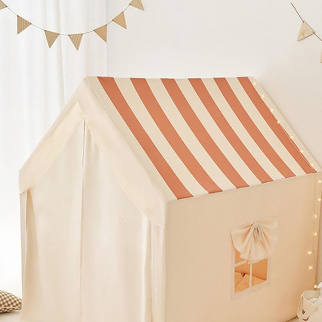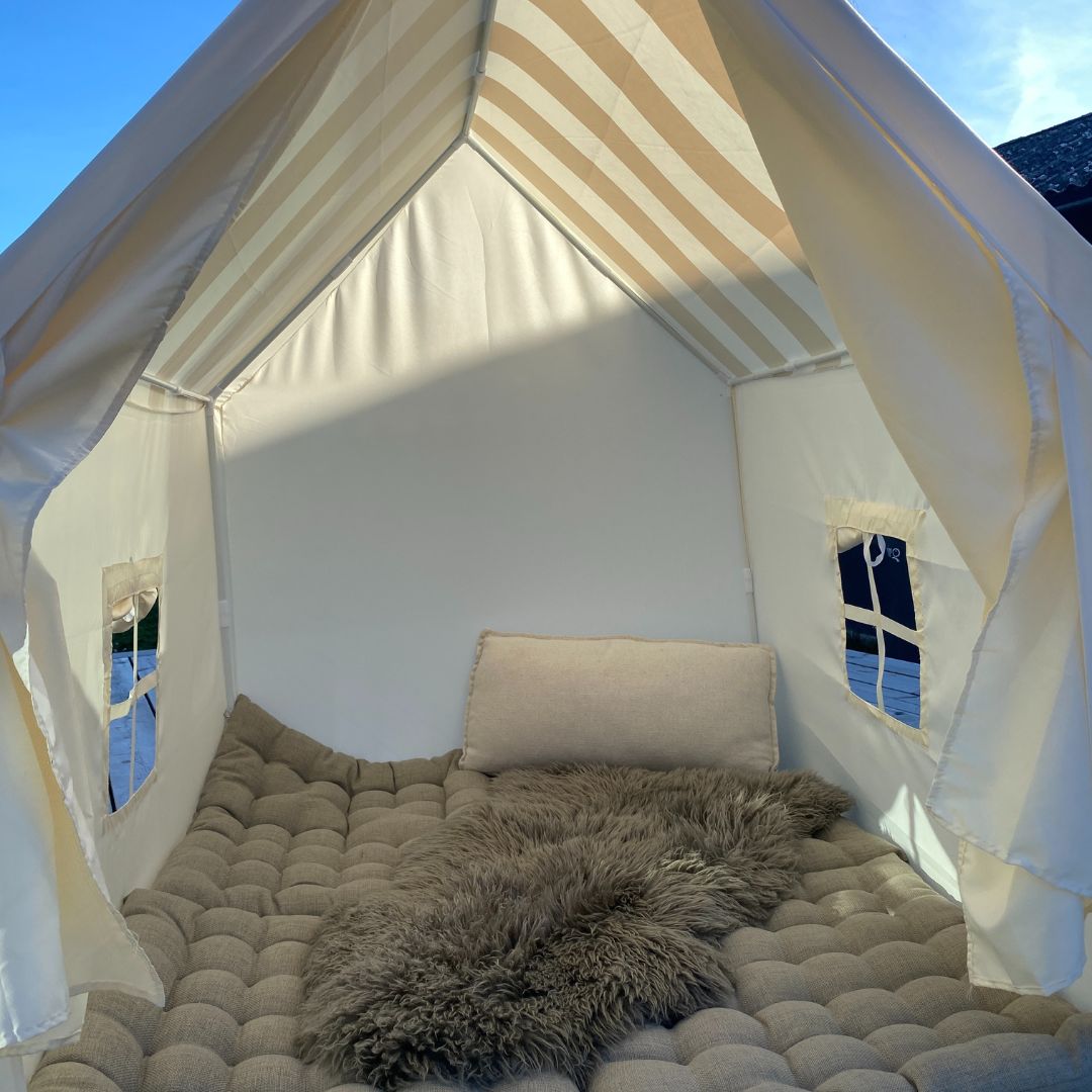 Legetelt stort, beige med stribet tag er bestilt og sendes så snart den er på lager