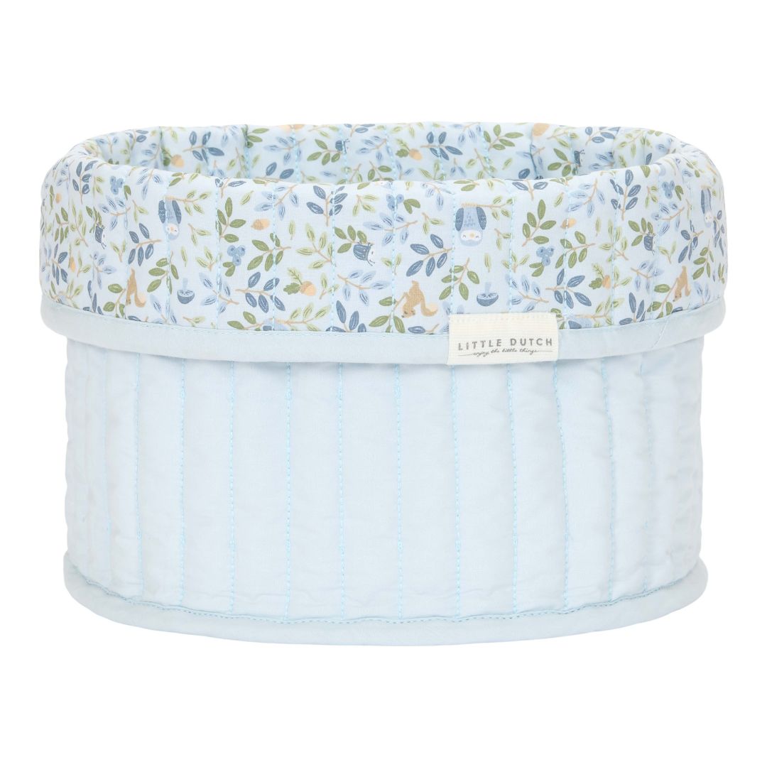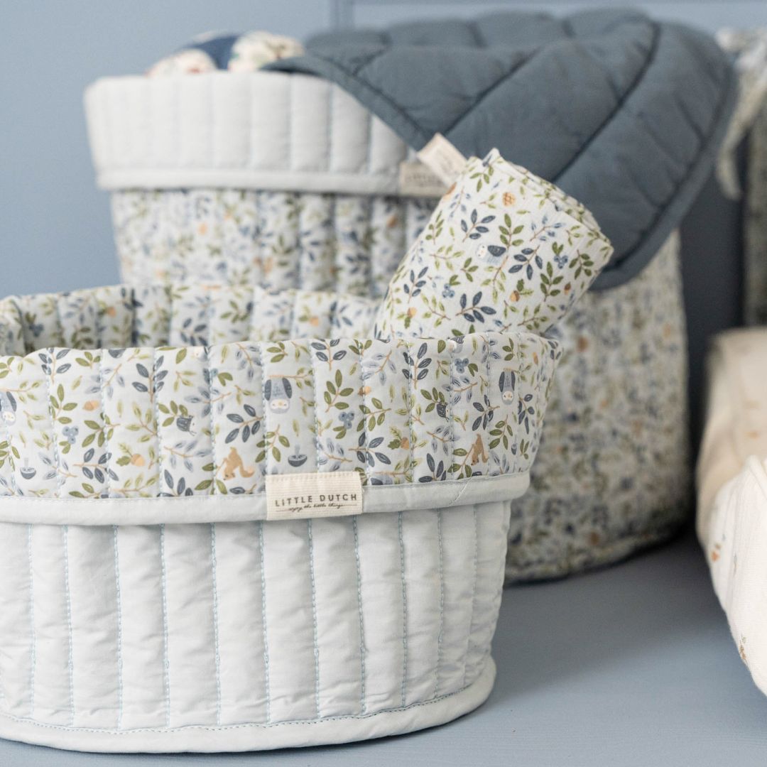 Stor rund opbevaringskurv i lyseblå med blomstret kant. Kurven er quiltet i 100% økologisk bomuld og kan vendes. Fra Little Dutch Forest Adventure kollektion. Stor rund opbevaringskurv med blomster og lyseblå ombukket kant. Kurven er quiltet  i 100% økologisk bomuld og kan vendes. Fra Little Dutch Forest Adventure kollektion.